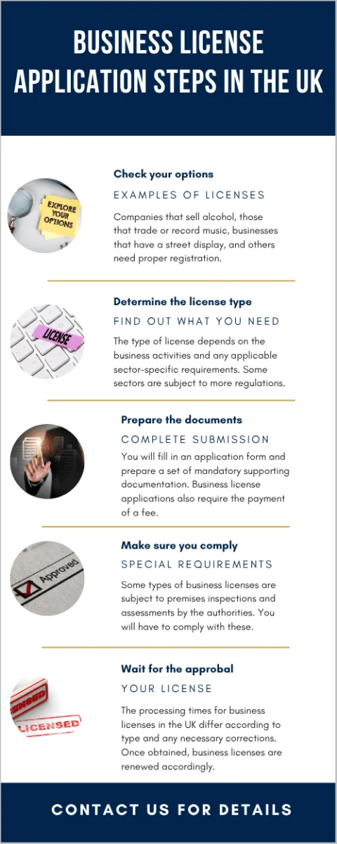 A business license in the UK ensures that the company complies with the regulations that apply to certain industries and that the customers are safe. Offering services or practising without a license in England and/or Wales is illegal and, in many cases, subject to a fine of approximately £1000.