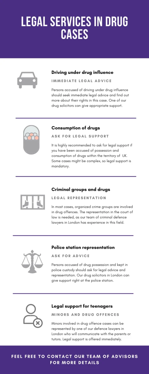 Citizens who have been caught driving under drug influence or arrested for drug possession should seek immediate legal assistance and advice from our team of drug lawyers. Our criminal defence solicitors in London are at the disposal of individuals kept in police custody who need legal support and want to be released on bail. Our team can represent you in the court of law if you have been accused of serious crimes in UK.